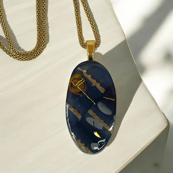 Dark Blue & Gold, Fused Glass Pendant, One of a Kind