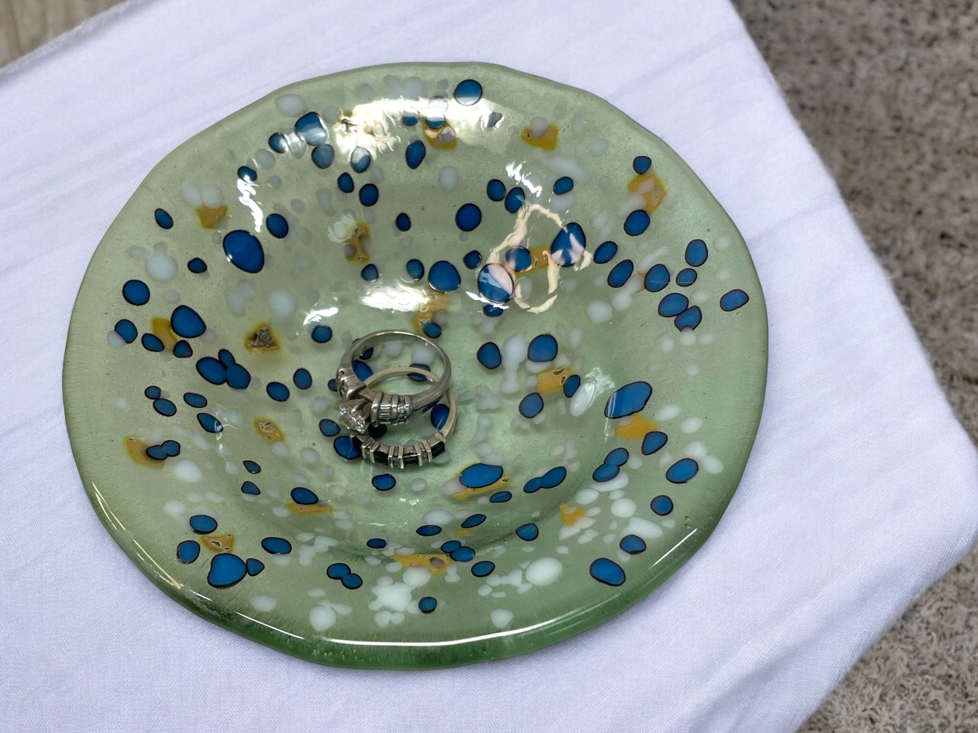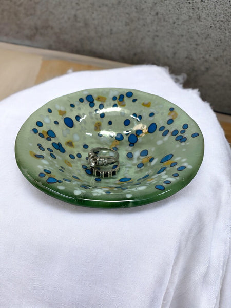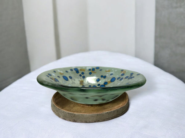 The dish is shallow, round, and has a slightly concave shape. Its surface is decorated with a multitude of small, speckled dots in various colors. The dots are predominantly shades of blue, cream, and pale yellow/gold. The colors are distributed unevenly across the surface, giving it a speckled, marbled appearance. This dish is made with reactive glasses creating unique, one of a kind details.