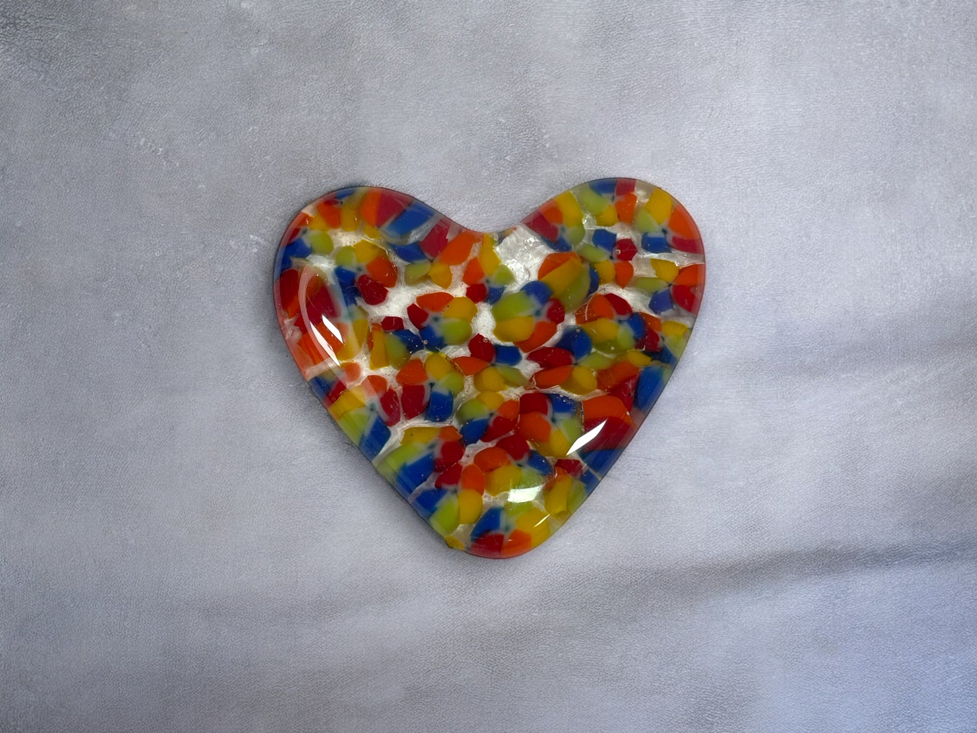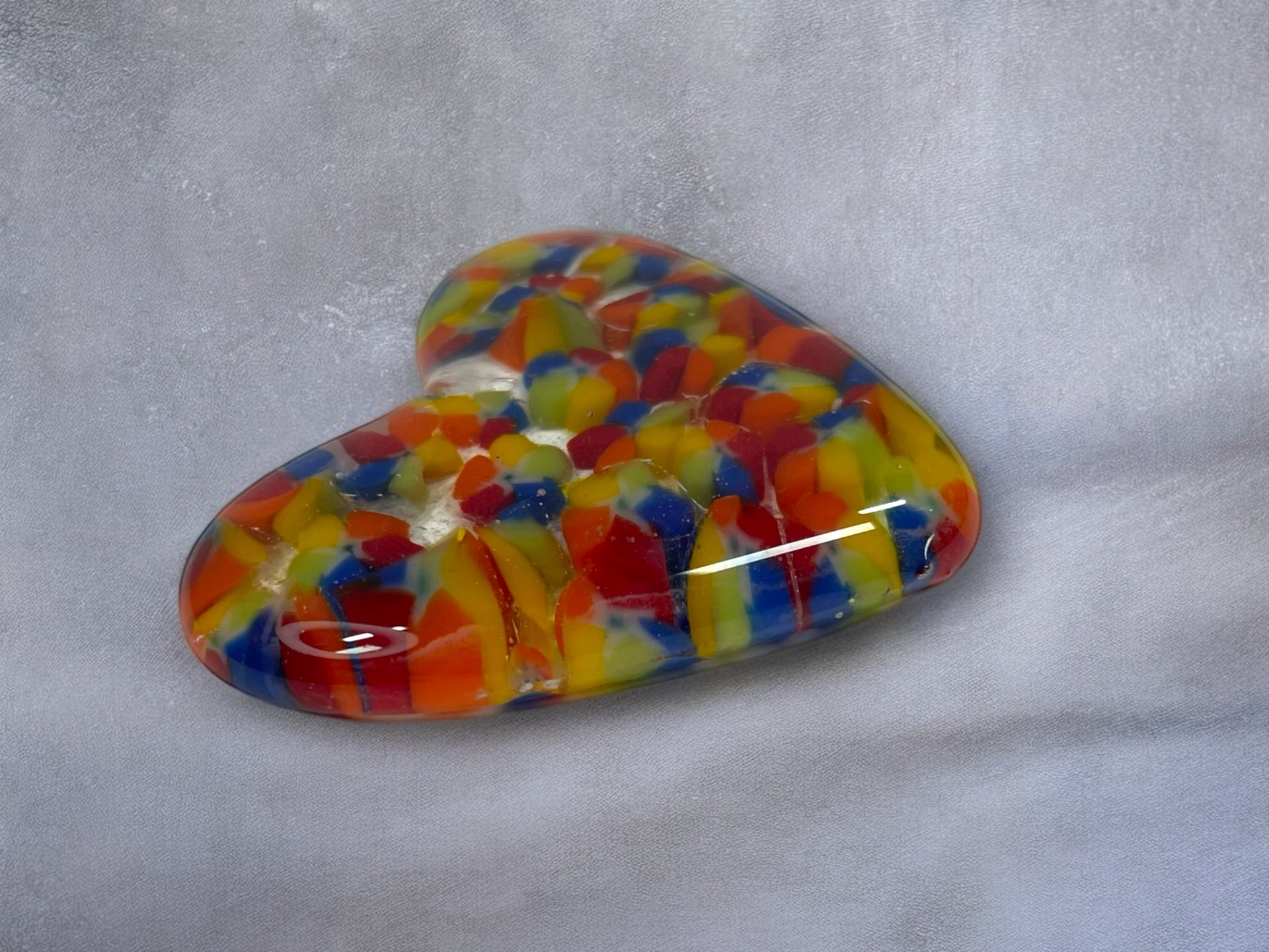 Introducing our Fused Glass Pocket Hug - a delightful addition to your collection! Made with rainbow Murrini and clear glass, this adorable heart can be kept in your pocket for a touch of whimsy and joy throughout the day. Brighten up your day with this unique and charming piece.  The perfect gift to let someone know you care and are thinking of them.