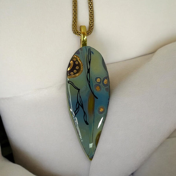 The pendant is oval-shaped, resembling a stylized leaf, and is made of a light teal-gray glass with a rich, slightly muted green-blue tone.