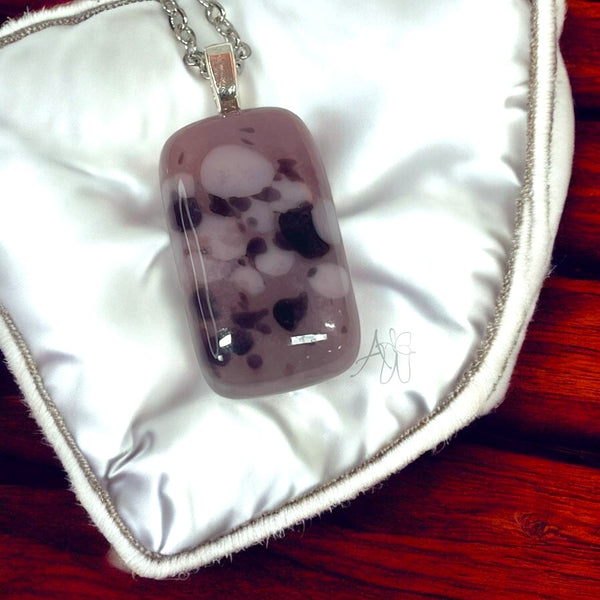 This pendant is a light, lavender-purple fused glass with small, dark-purple specks and swirls distributed throughout.