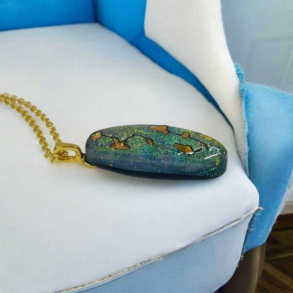The pendant is made of fused glass, exhibiting a multicolored iridescent effect. Shades of green, gold, and yellow are prominent, with a glittery texture throughout the glass. Intricate designs, resembling abstract patterns on the glass surface in outlines against the multicolored background. Patches of gold elements are incorporated into the designs.