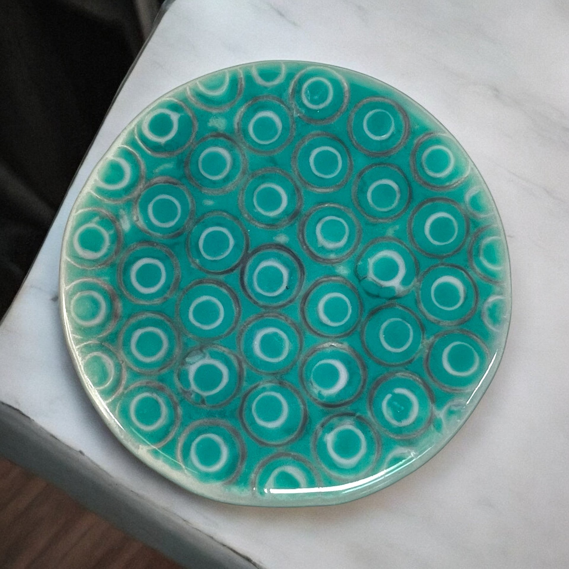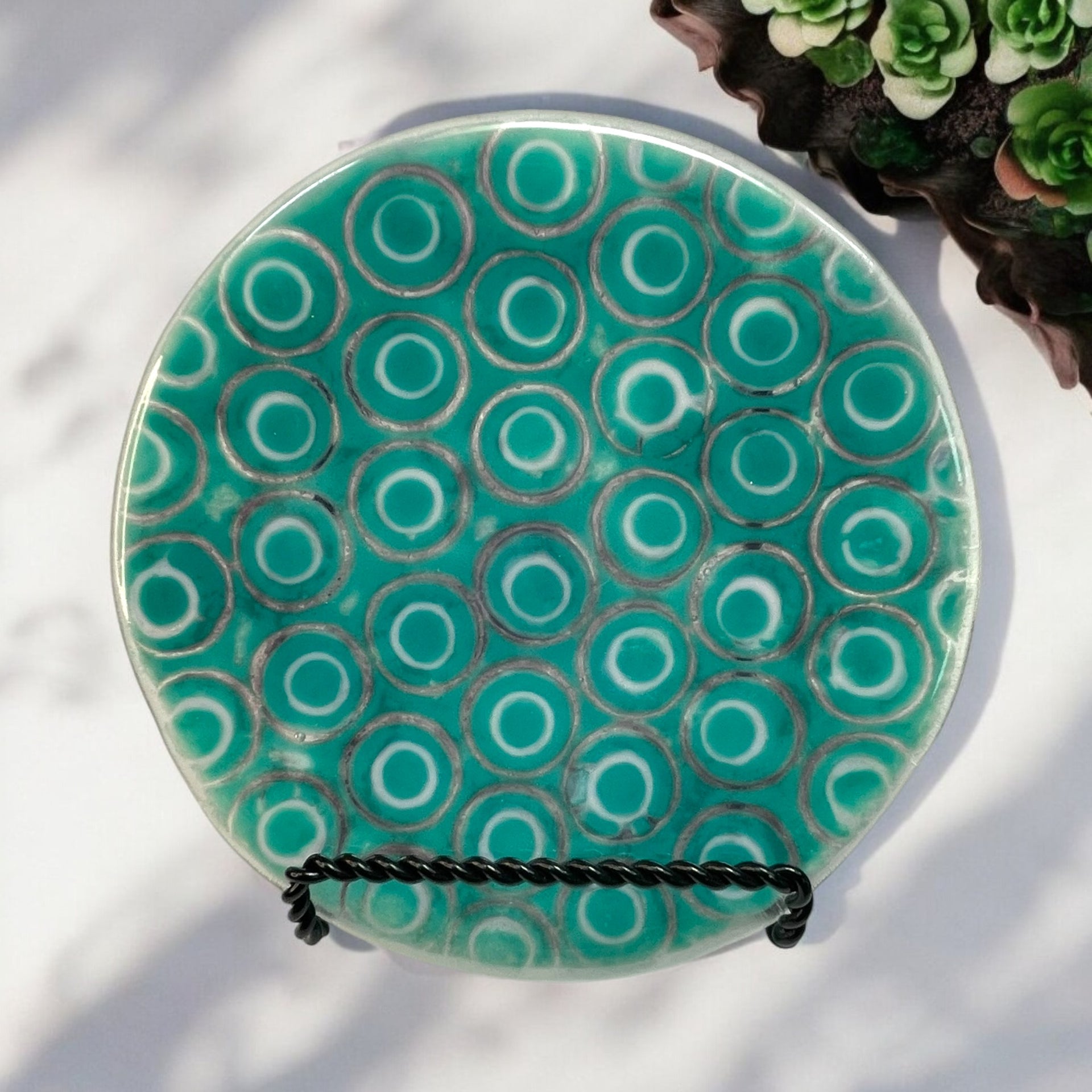 The decorative plate has a repeating pattern of white circles within teal circles. The white circles have a slightly translucent or speckled appearance. The teal color is a vibrant, almost turquoise shade.