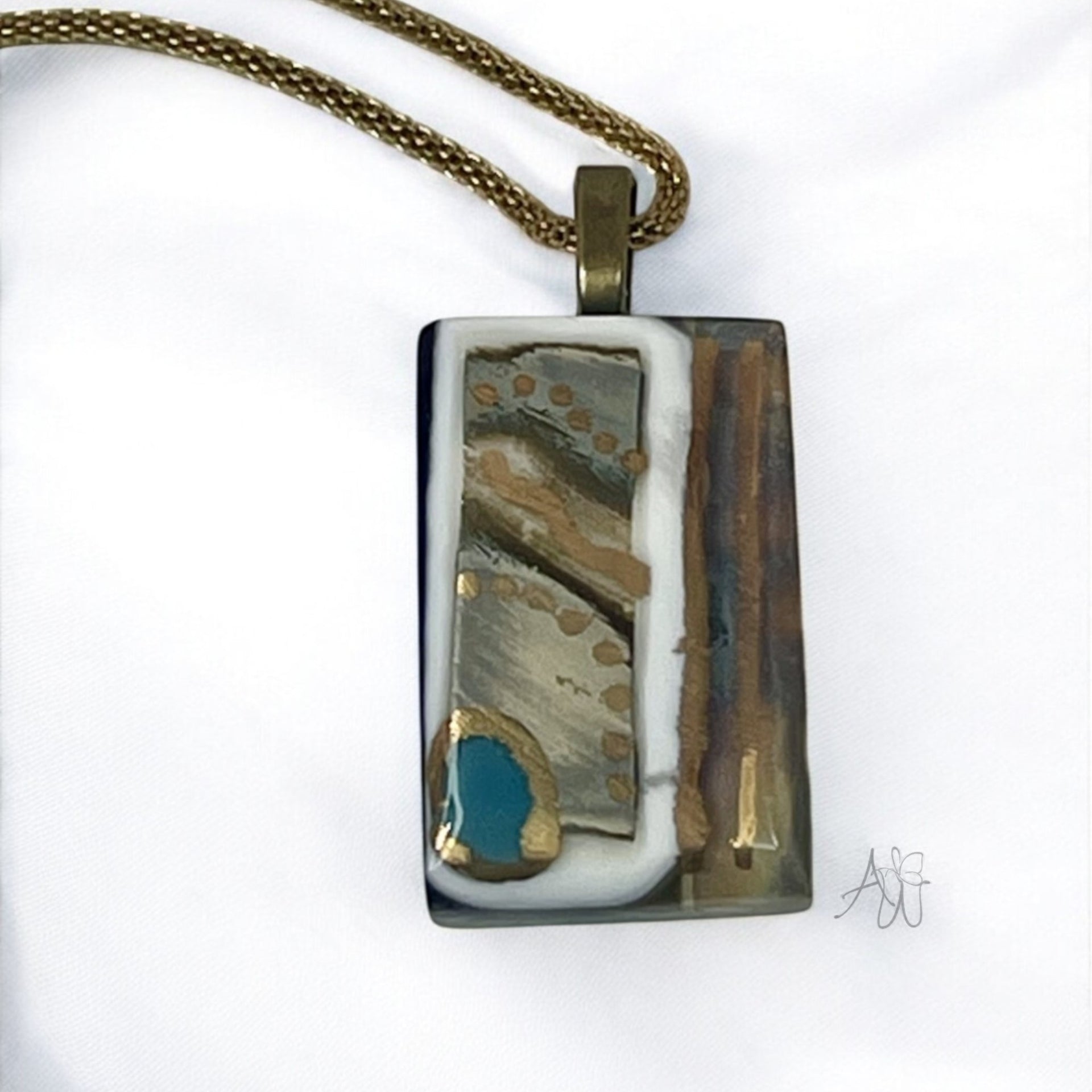 A glass pendant made and cut by hand. This pendant consists of three layers of glass with each layer being fired in a kiln. It is then shaped and beveled to create one of a kind piece. The pendant measures 1.25" wide & 1.5" long with a thickness of 8mm and comes with an 18" gold plated mesh chain.