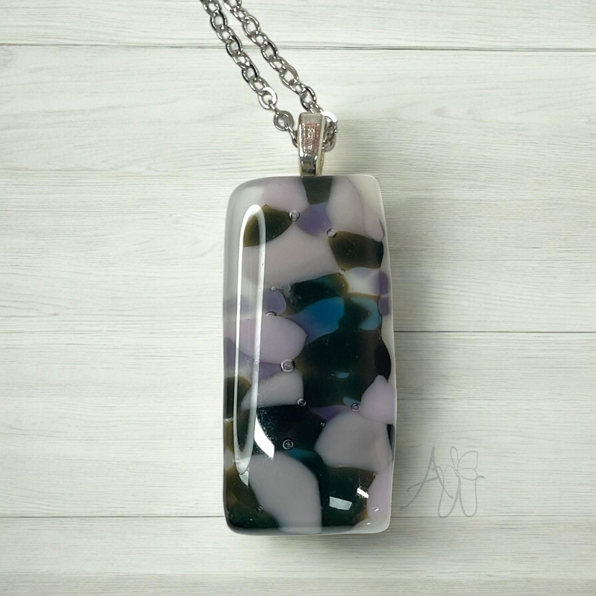Rectangle Fused Glass Pendant, White, Purple, Blues. Handmade, One of a Kind