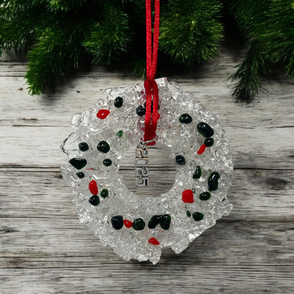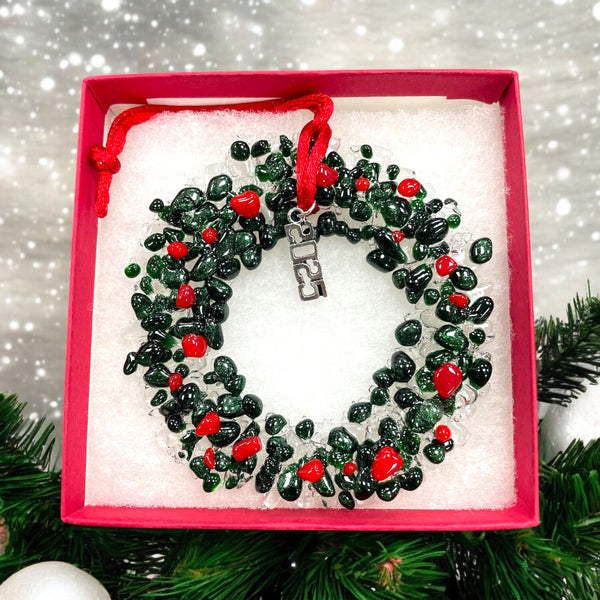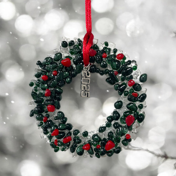 Adorn your Christmas Tree with this exquisite ornament, a charming wreath crafted from vibrant green and red fused glass. The intricate design features a delicate balance of colors, evoking the spirit of the season. A silver tag engraved with "2025" adds a personal touch, making it a perfect keepsake for years to come. Hang it on your tree or display it as part of your festive decor, and let it bring a touch of warmth and joy to your space.