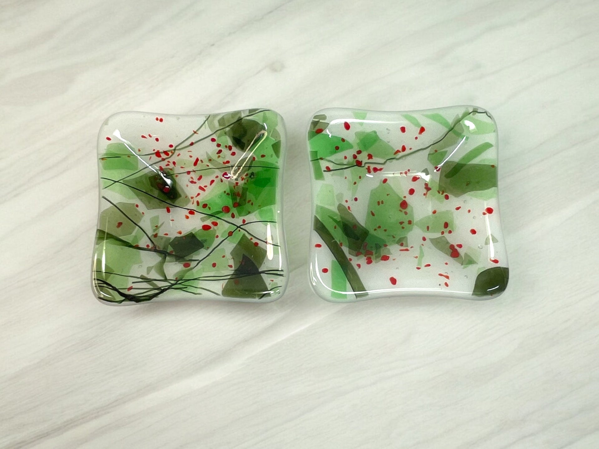 The dishes are a white color, with a design of small, scattered red and green spots and streaks that create a pattern resembling foliage and berries. The designs are not symmetrical but have a somewhat organic, random feel. The dishes are  made of fused glass.