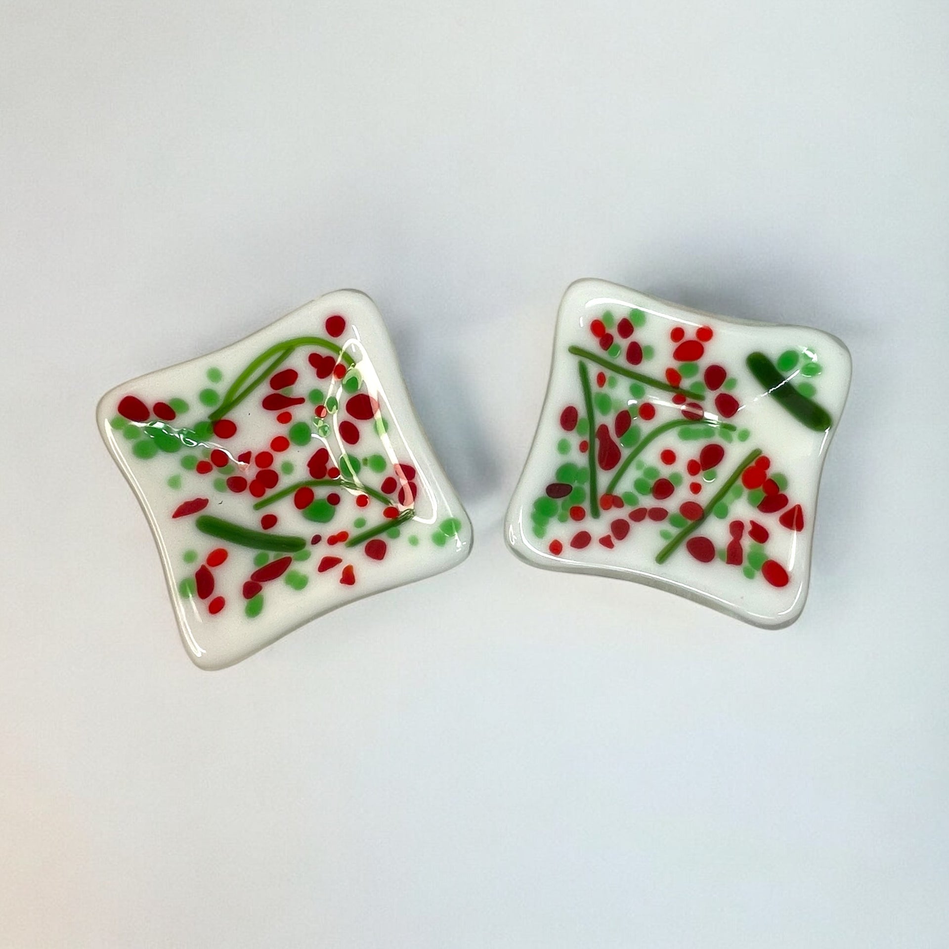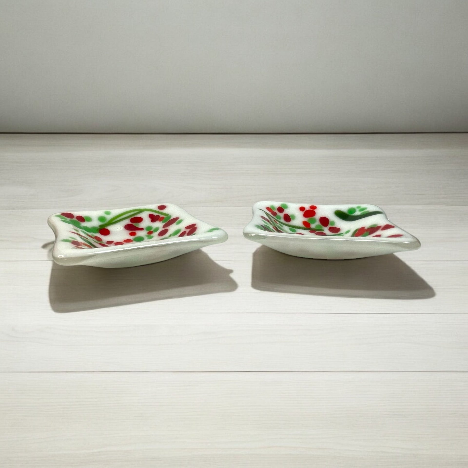 The dishes are a white color, with a design of small, scattered red and green spots and streaks that create a pattern resembling foliage and berries. The designs are not symmetrical but have a somewhat organic, random feel. The dishes are  made of fused glass.