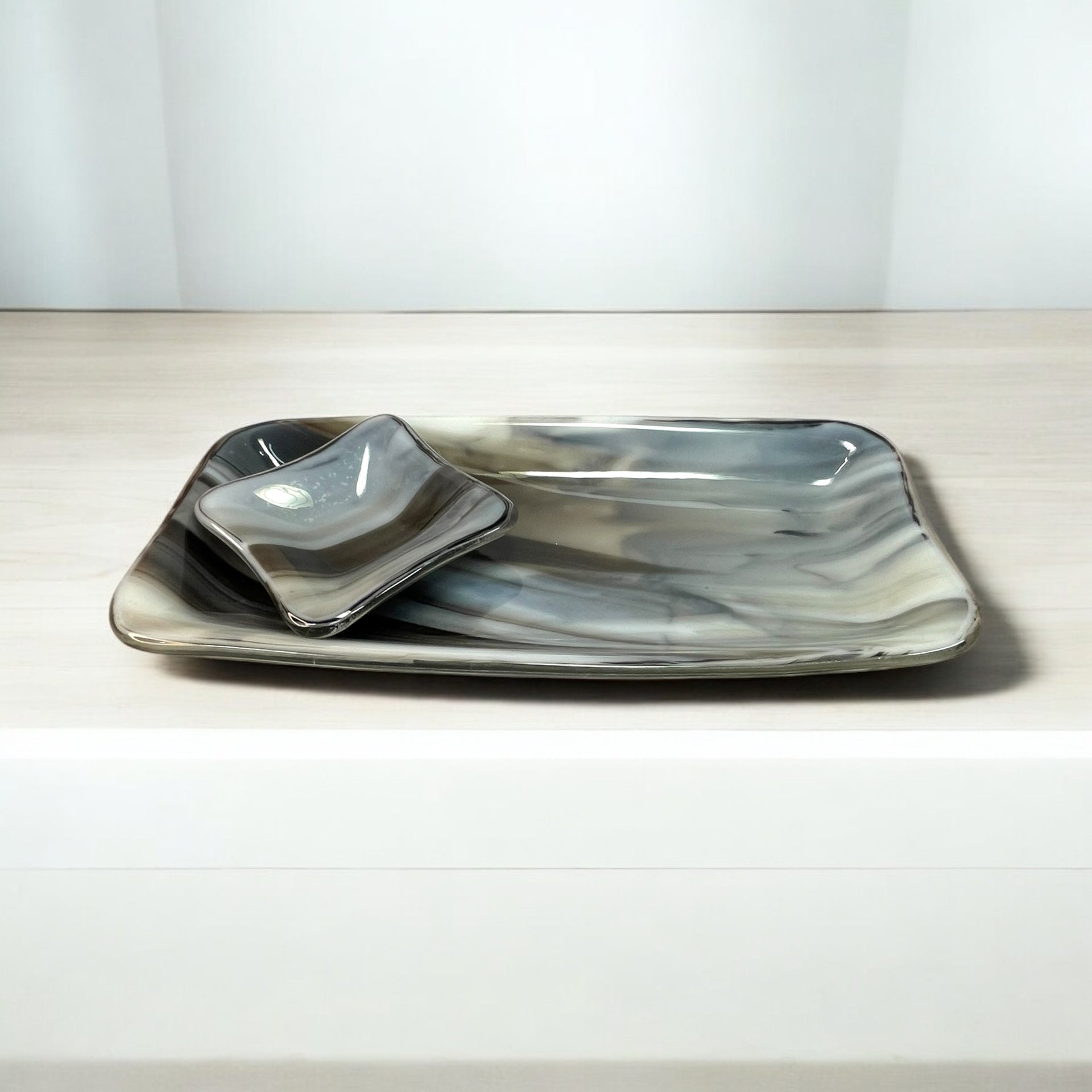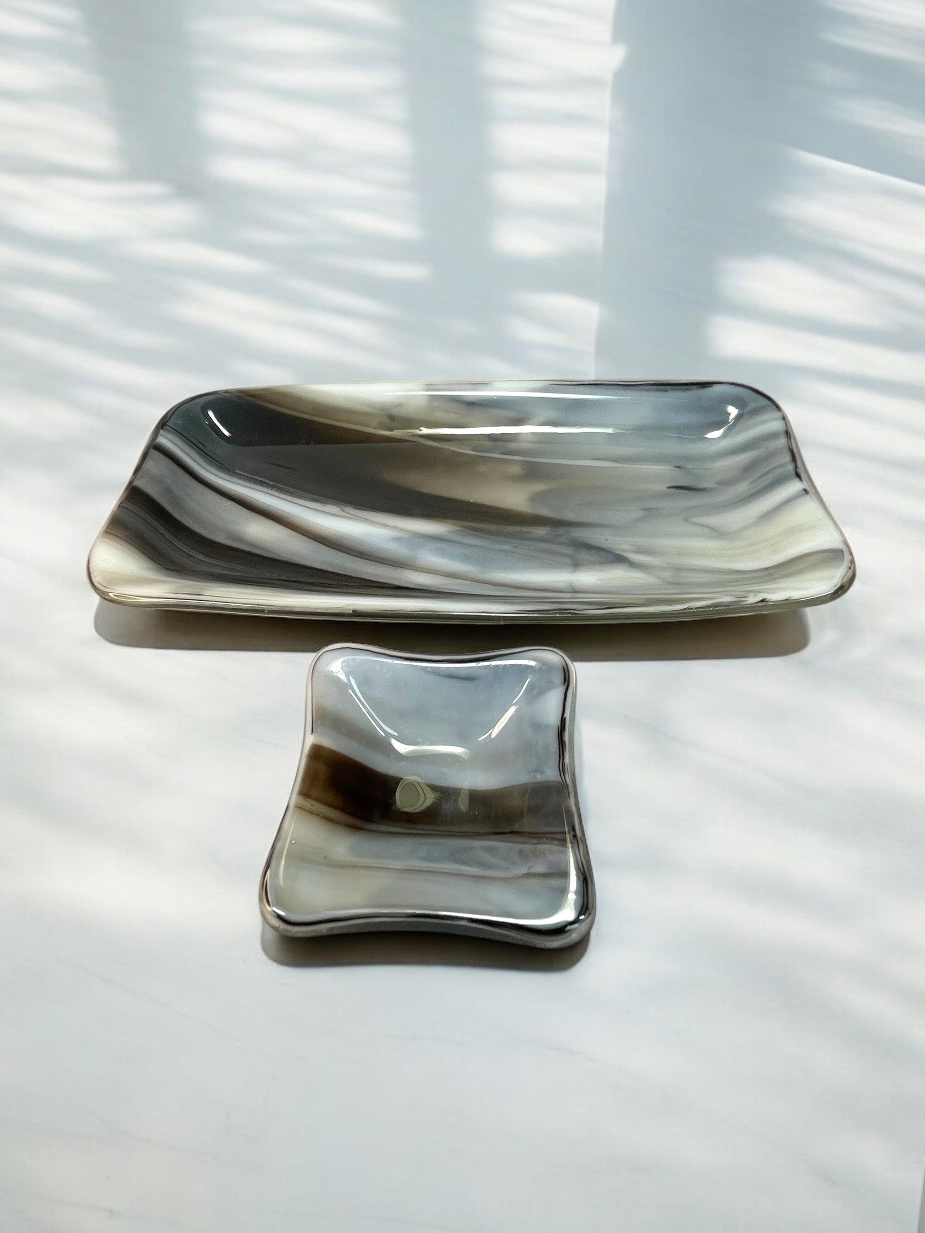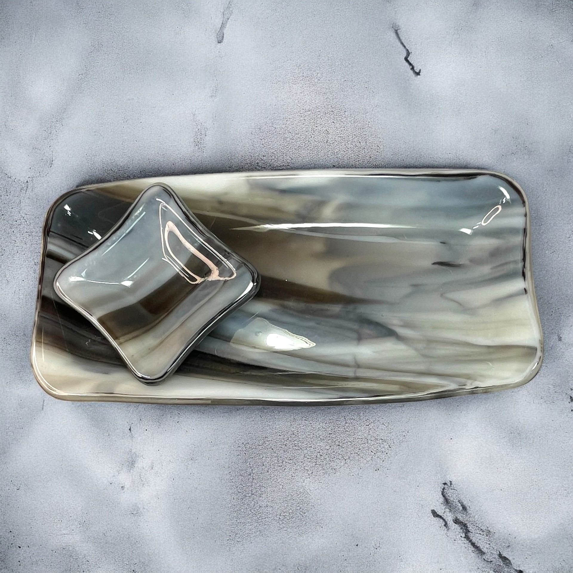A turquoise blue and brown marbled fused glass sushi plate set.  The larger plate is rectangle in shape and approximately 9.5" X 4.5".  The matching smaller plate is 3.5" square.