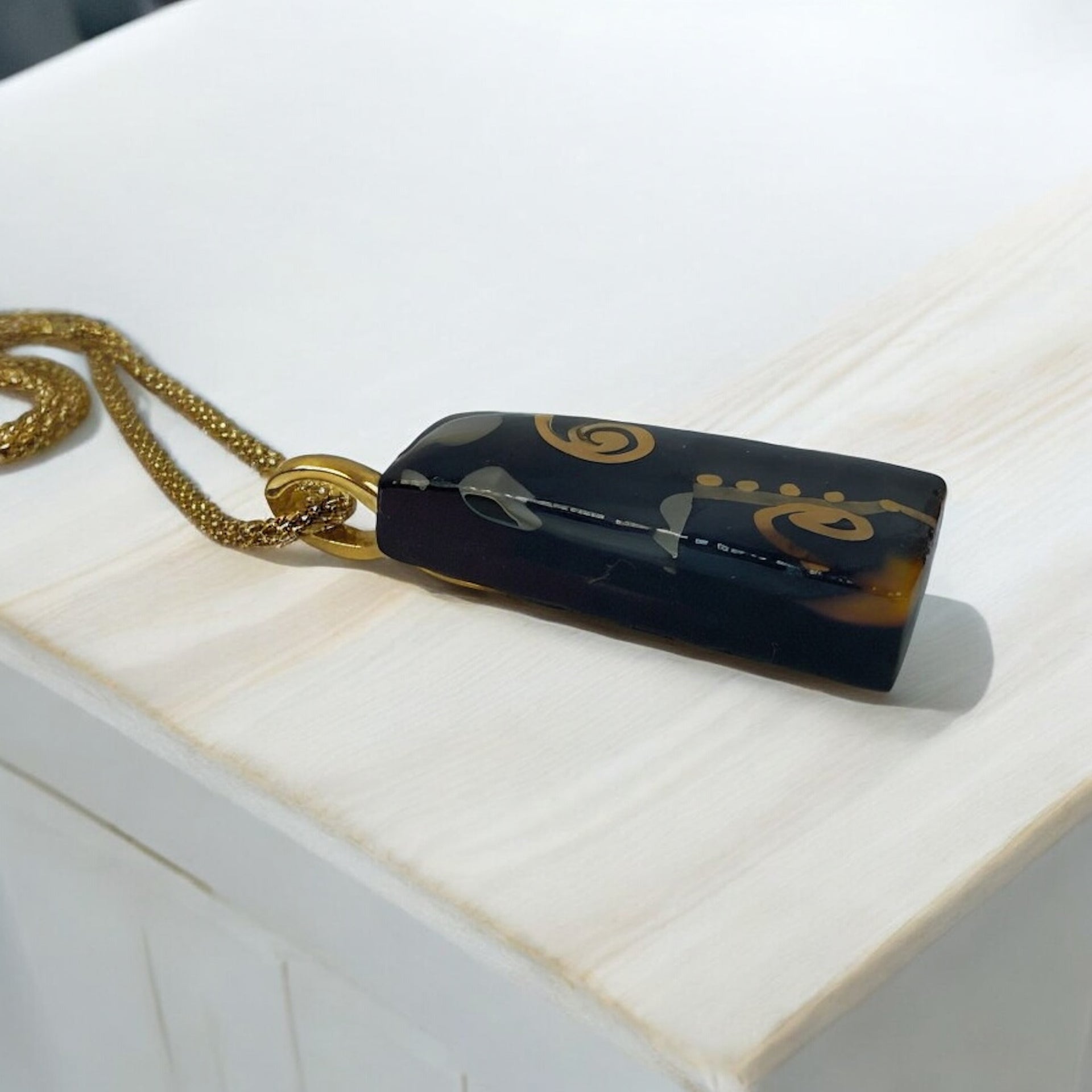 This pendant is a rectangular and a dark-navy blue. The pendant has a design of swirls, stylized shapes, and small, dispersed speckles/dots of light gray and gold. The golden details are primarily swirls and thin lines, creating a patterned effect across the dark background.