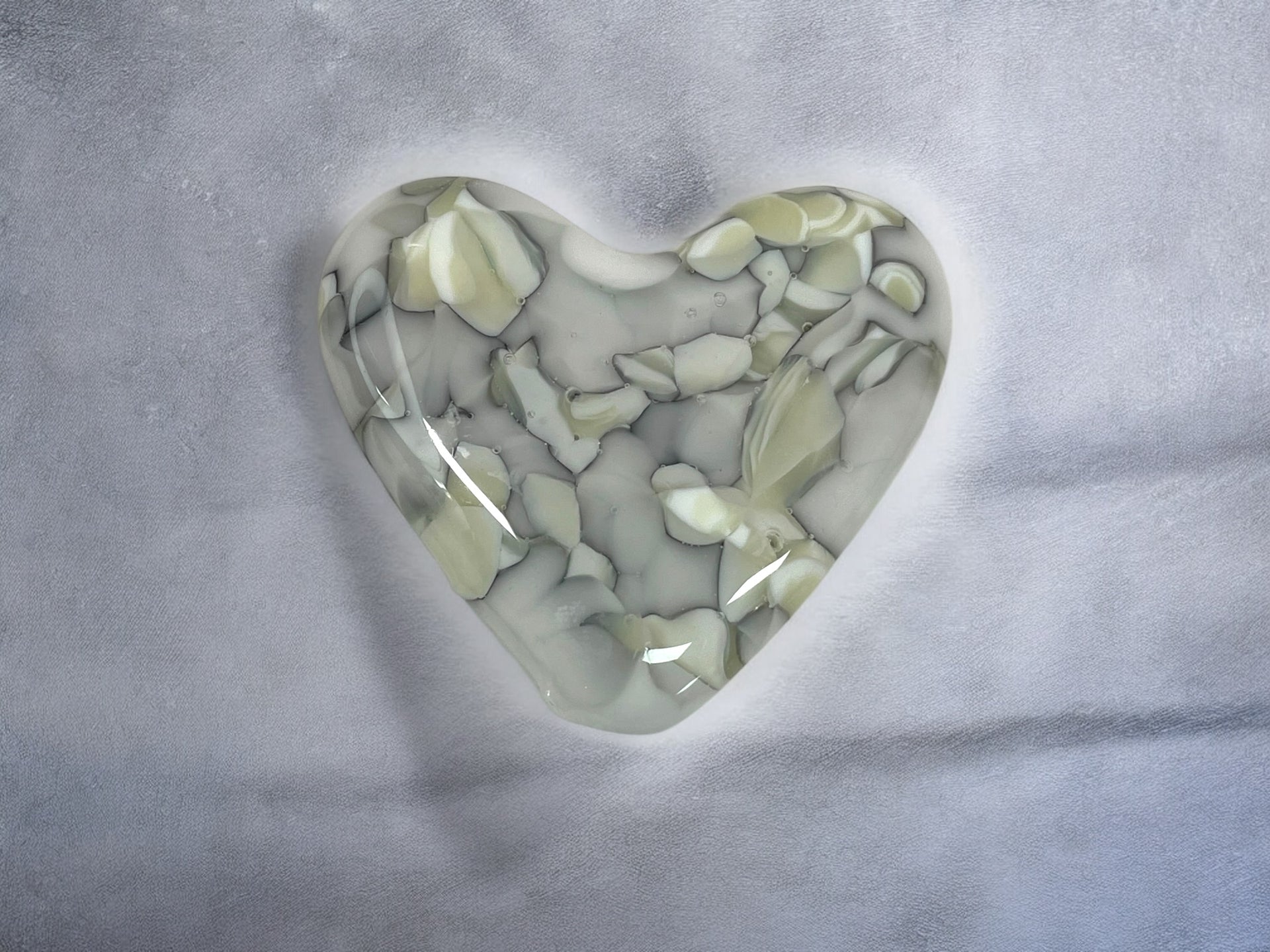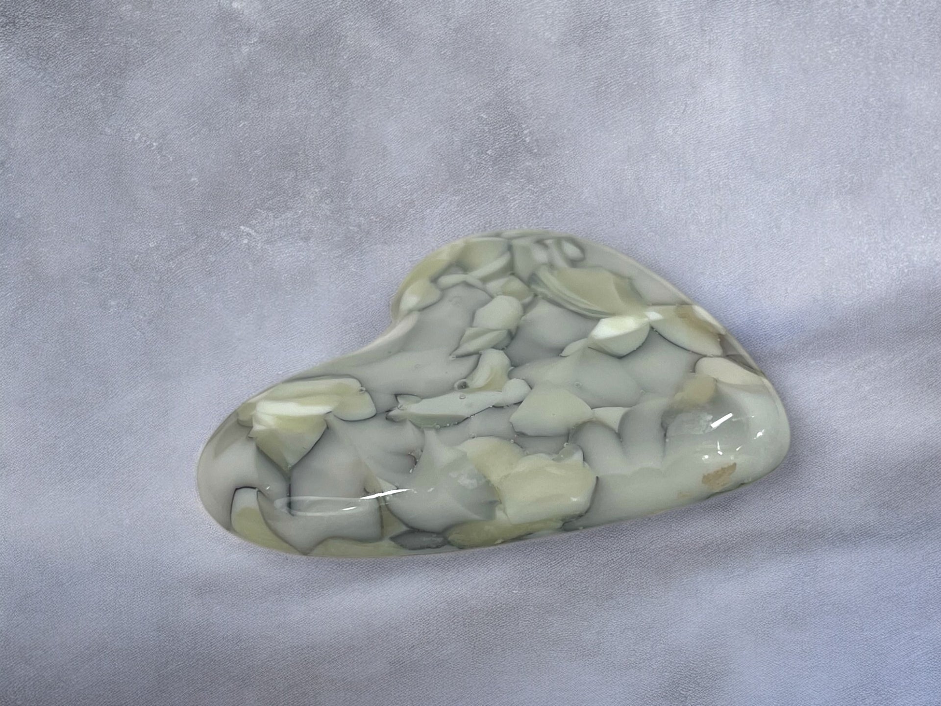 Introducing our Fused Glass Pocket Hug - a delightful addition to your collection! Made with white and vanilla glass frit to create reactions within the glass, this adorable heart can be kept in your pocket for a touch of whimsy and joy throughout the day. Brighten up your day with this unique and charming piece.  The perfect gift to let someone know you care and are thinking of them.