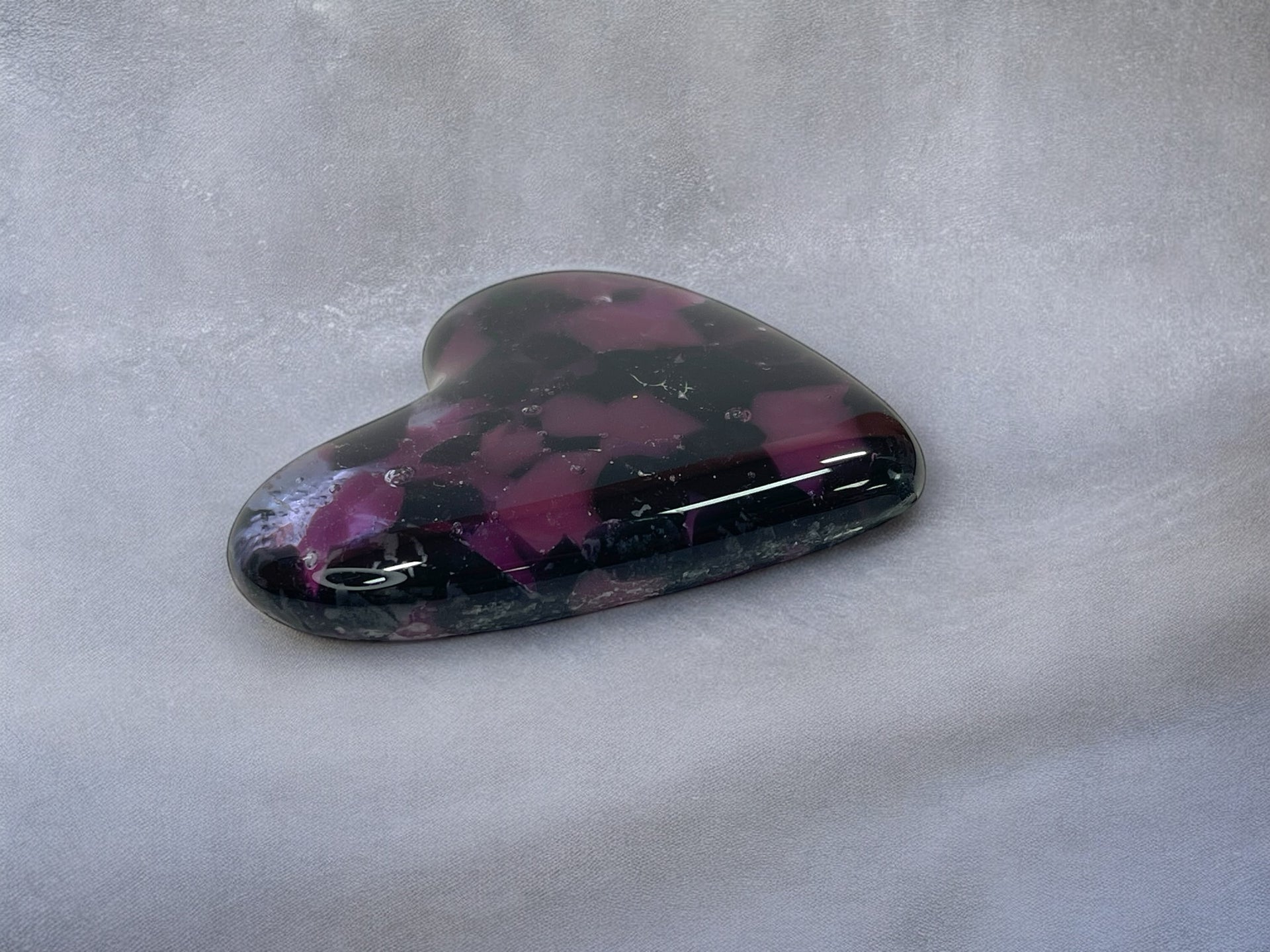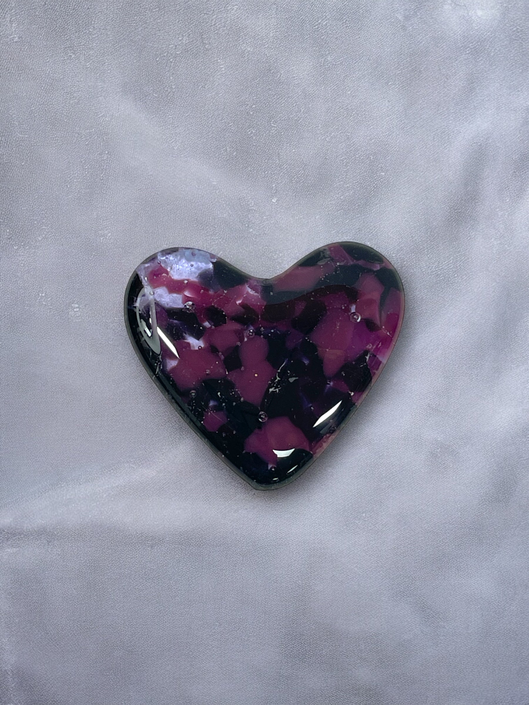 Introducing our Fused Glass Pocket Hug - a delightful addition to your collection! Made with dark purple and violet glass frit, this adorable heart can be kept in your pocket for a touch of whimsy and joy throughout the day. Brighten up your day with this unique and charming piece.  The perfect gift to let someone know you care and are thinking of them.