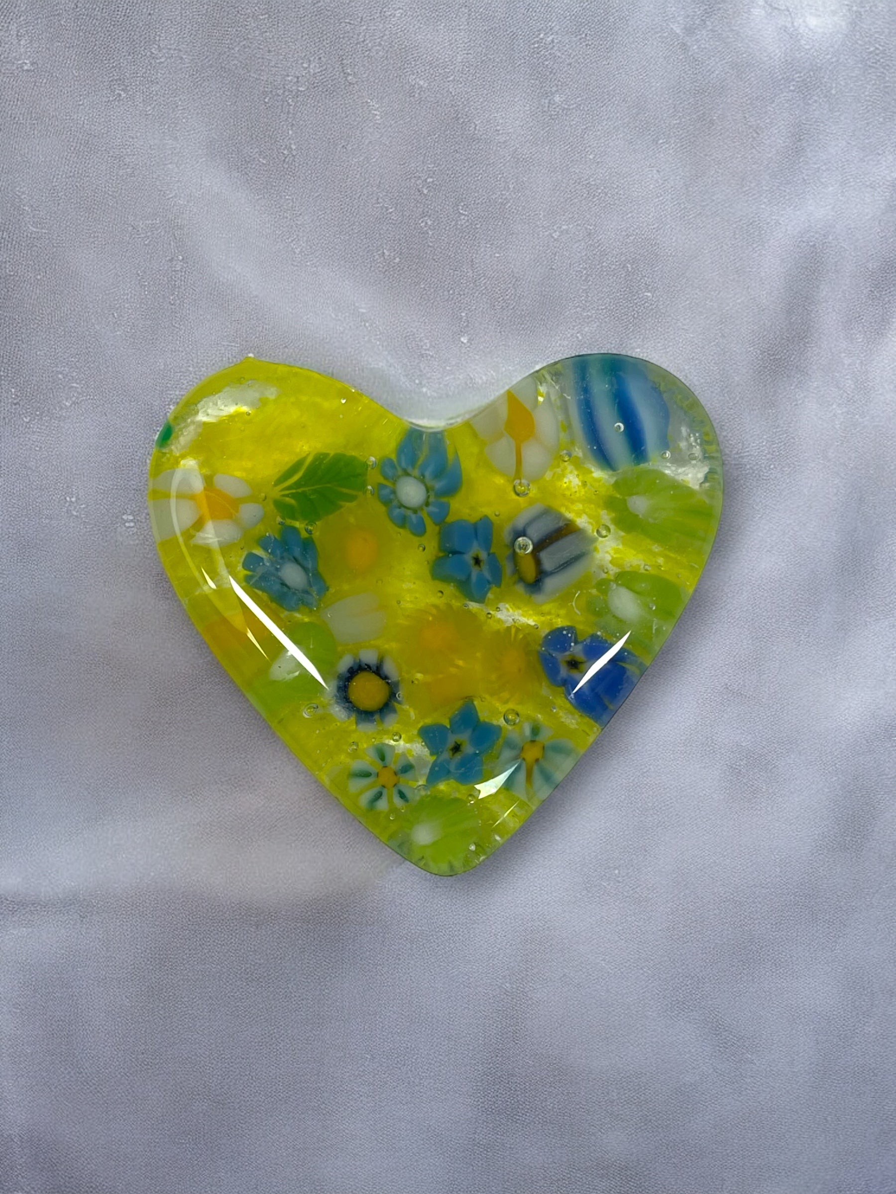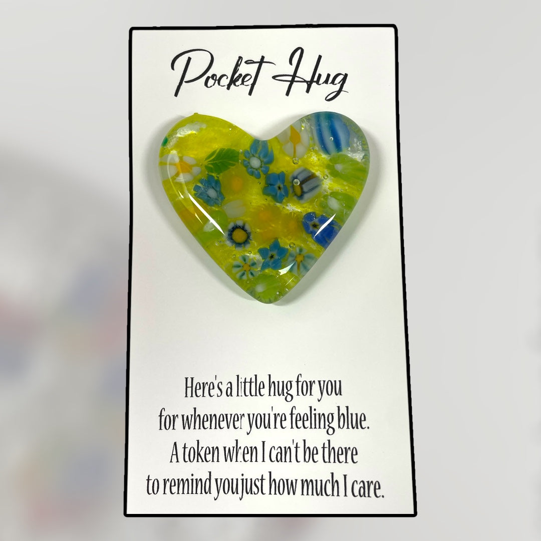 Introducing our Fused Glass Pocket Hug - a delightful addition to your collection! Made with yellow and blue Murrini, this adorable heart can be kept in your pocket for a touch of whimsy and joy throughout the day. Brighten up your day with this unique and charming piece.  The perfect gift to let someone know you care and are thinking of them.