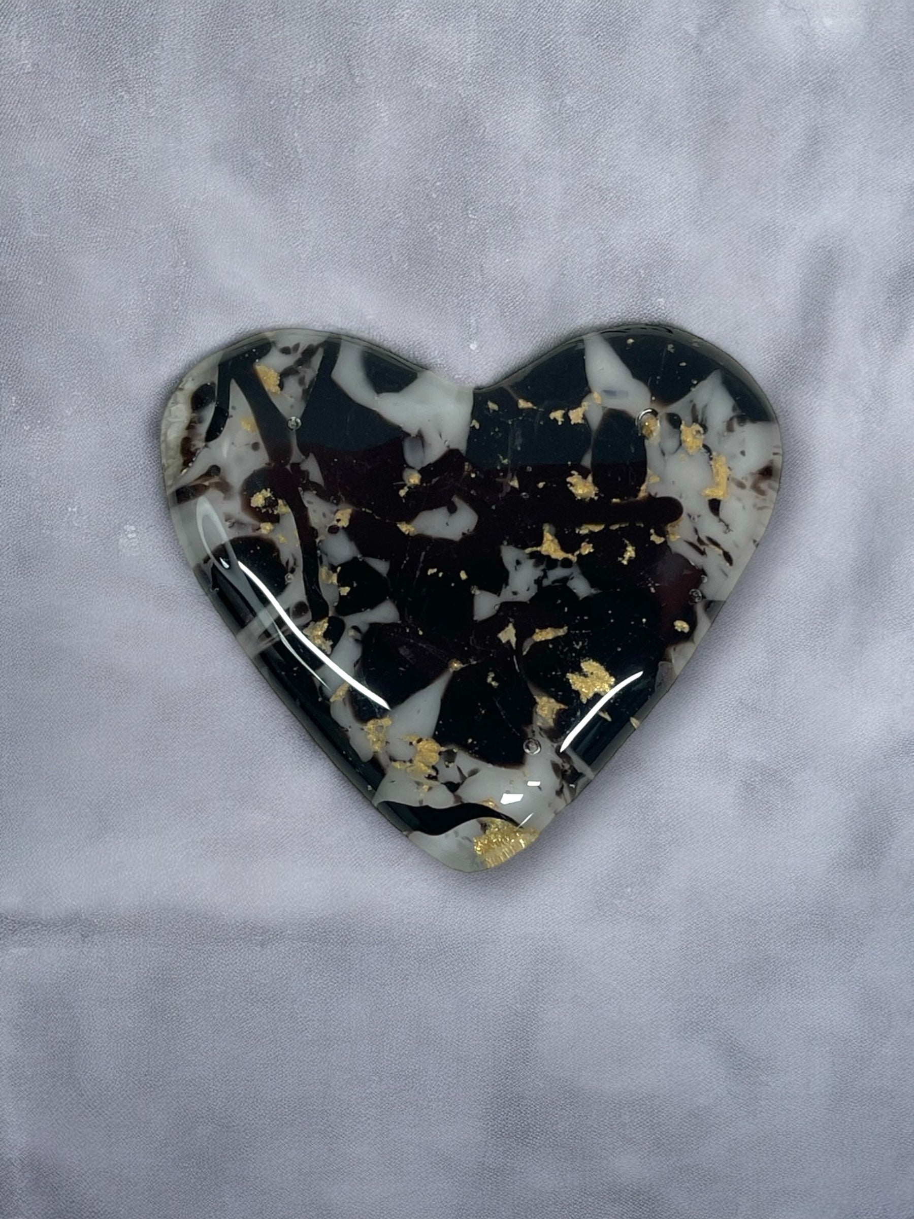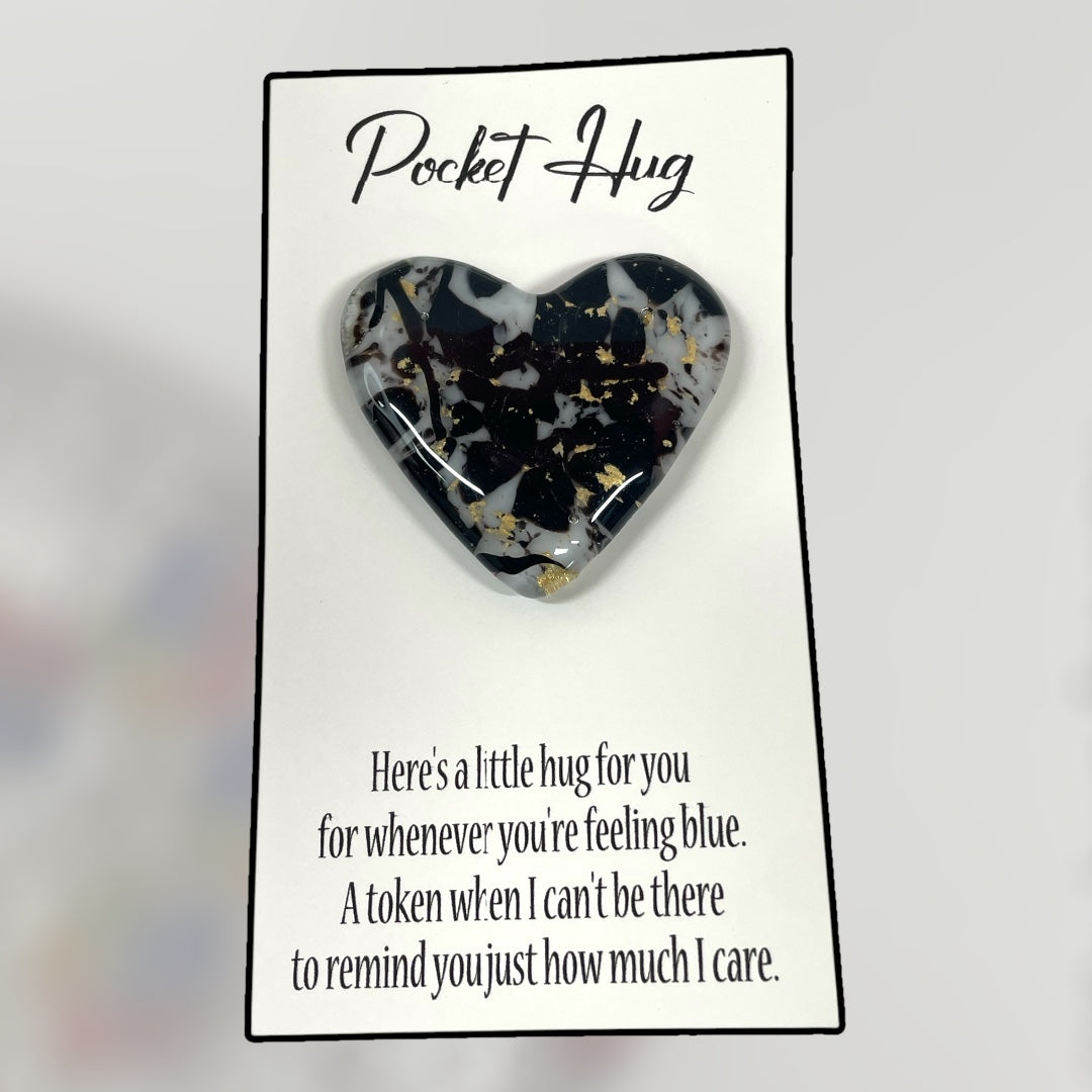 Introducing our Fused Glass Pocket Hug - a delightful addition to your collection! Made with black and white glass flakes accented with gold mica, this adorable heart can be kept in your pocket for a touch of whimsy and joy throughout the day. Brighten up your day with this unique and charming piece.  The perfect gift to let someone know you care and are thinking of them.