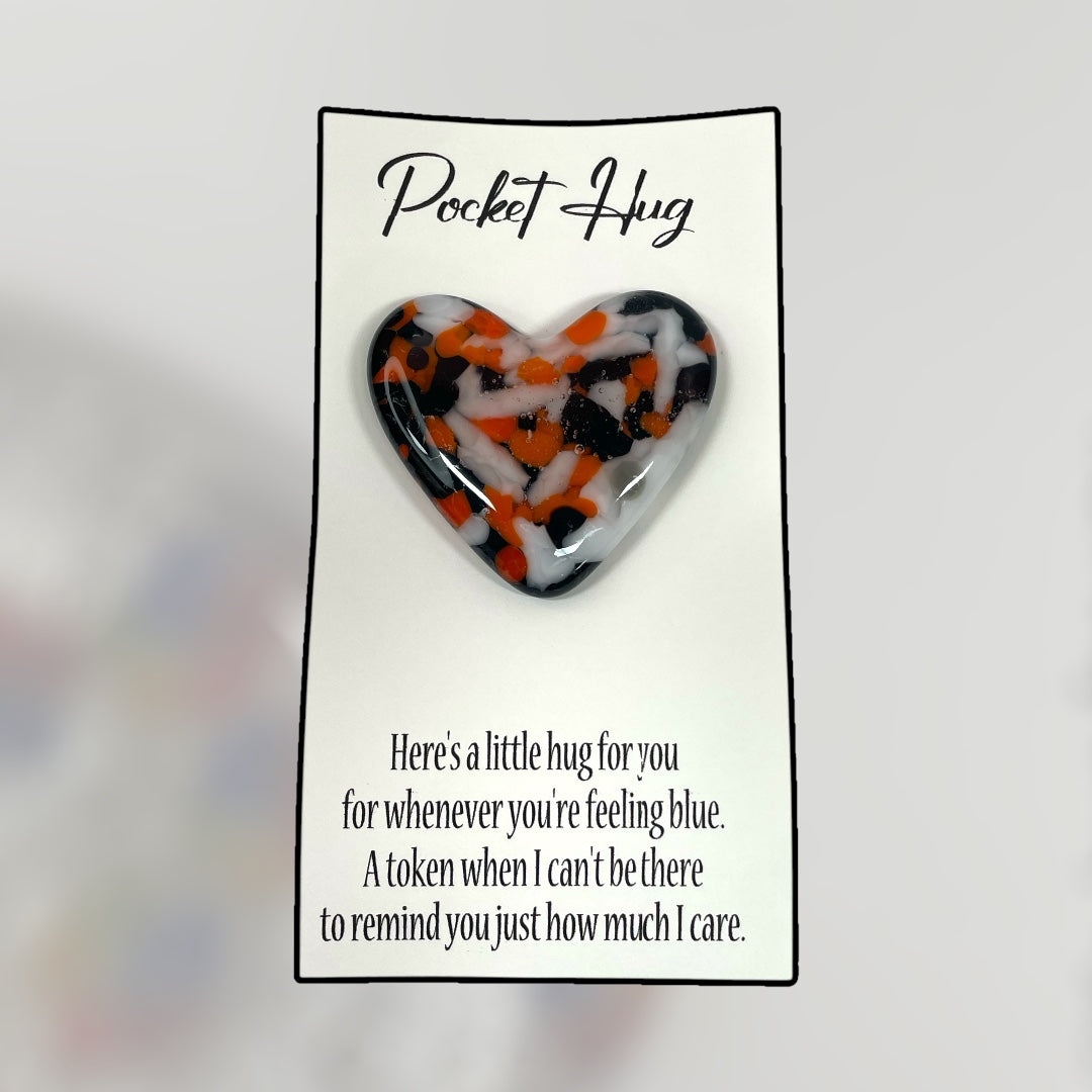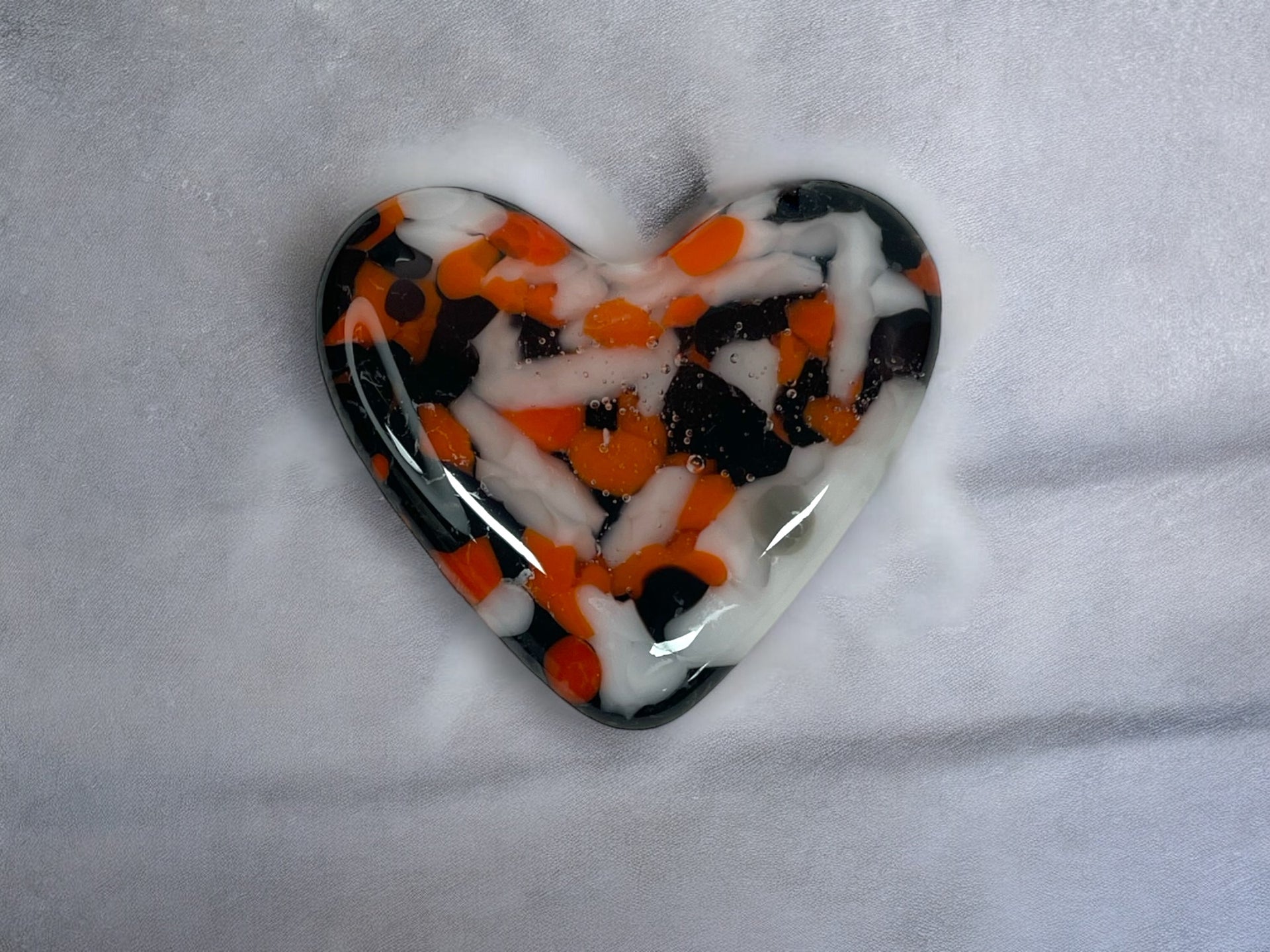 Introducing our Fused Glass Pocket Hug - a delightful addition to your collection! Made with orange, black and white glass flakes, this adorable heart can be kept in your pocket for a touch of whimsy and joy throughout the day. Brighten up your day with this unique and charming piece.  The perfect gift to let someone know you care and are thinking of them.  A great idea for your favorite teacher!  Can be requested in school colors!