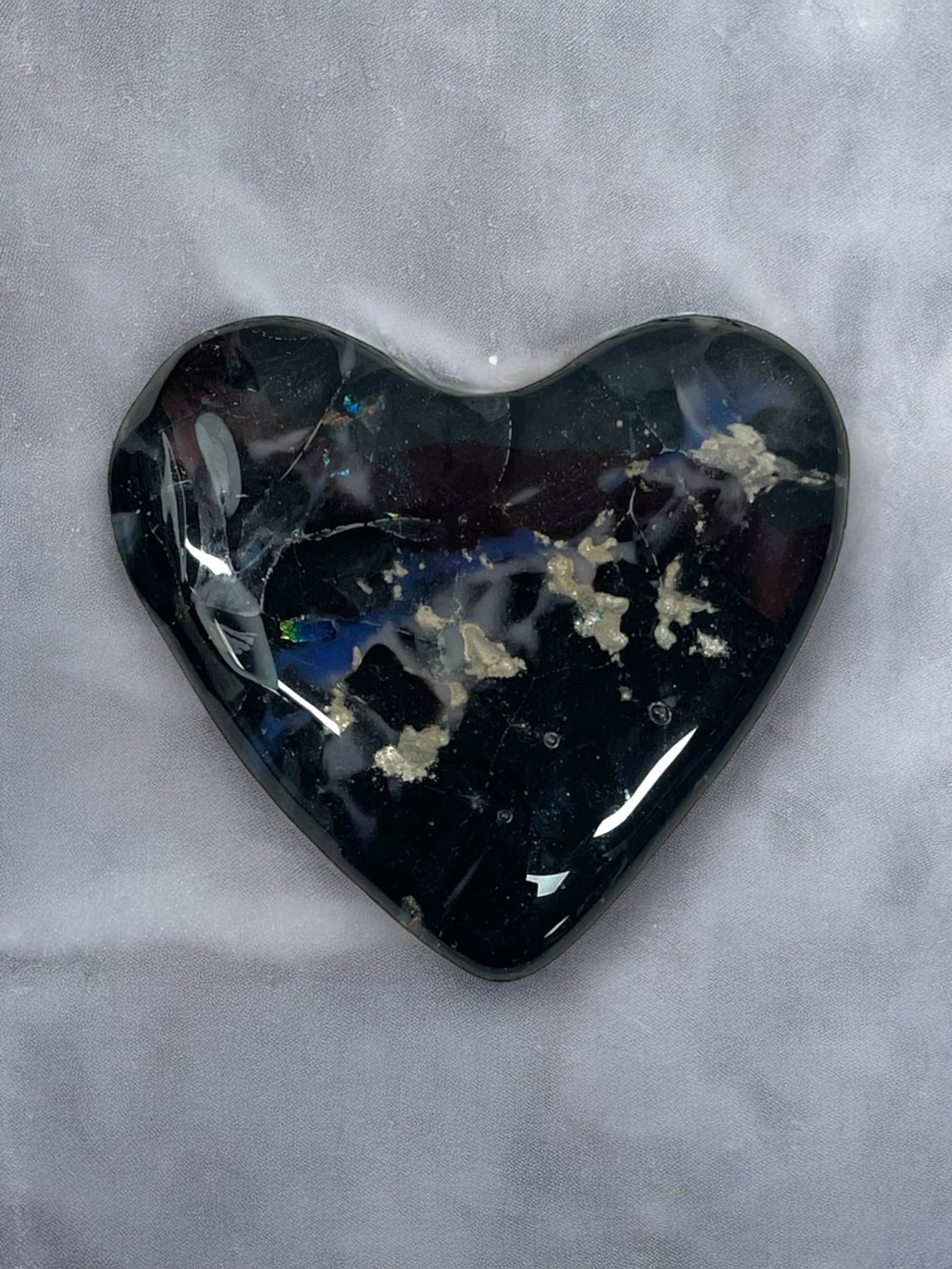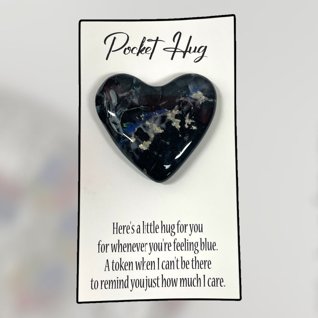 Introducing our Fused Glass Pocket Hug - a delightful addition to your collection! Made with beautiful shades of black and gray accented with gold mica, this adorable heart can be kept in your pocket for a touch of whimsy and joy throughout the day. Brighten up your day with this unique and charming piece.  The perfect gift to let someone know you care and are thinking of them.