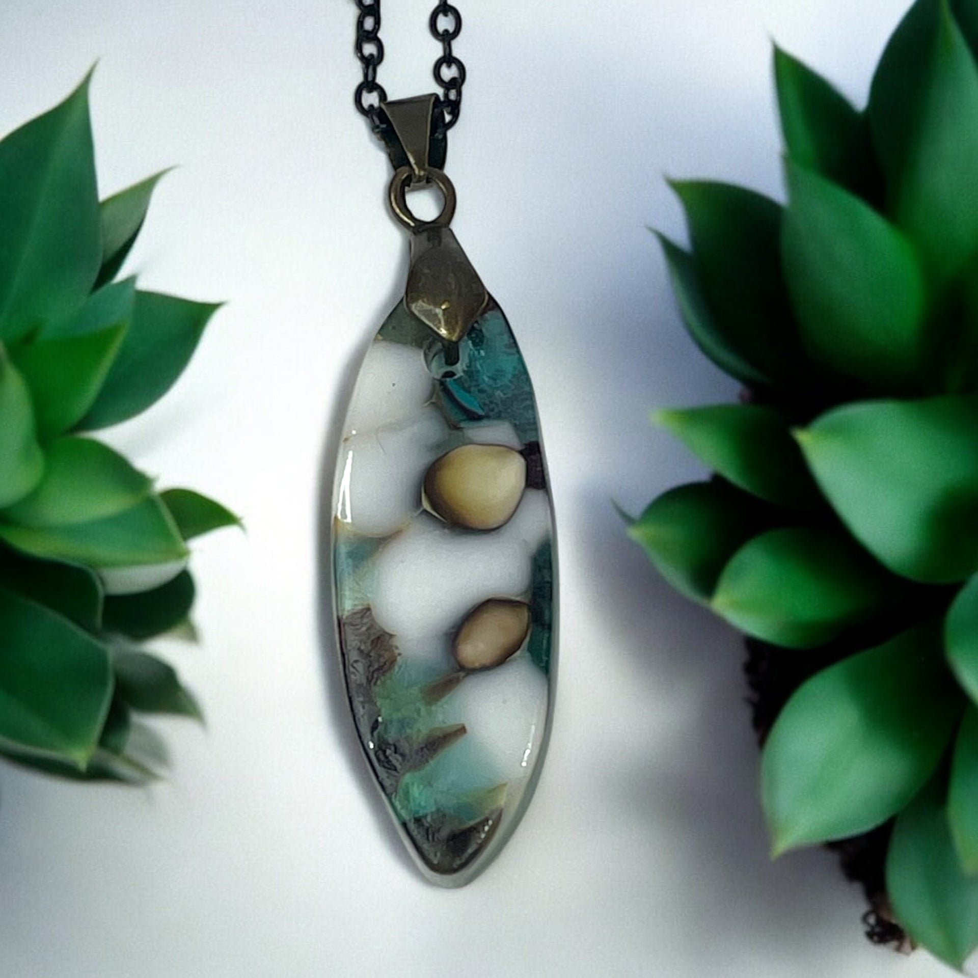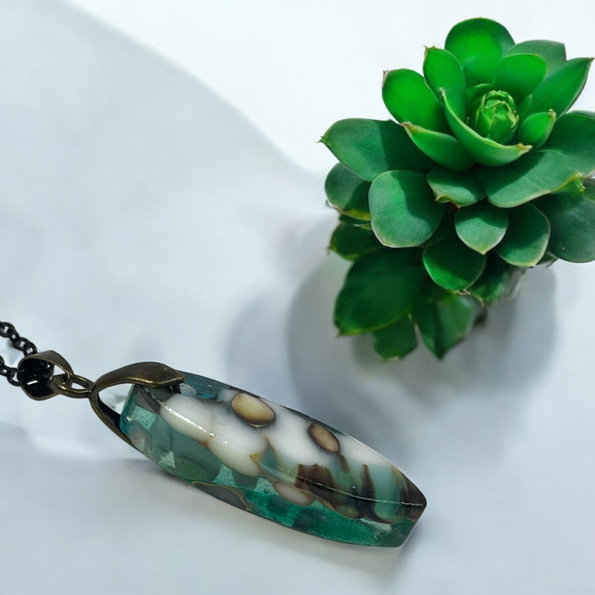 This pendant is oval-shaped and made of fused glass, with embedded pieces of a light, almost white, substance; darker brown/tan and teal/turquoise-colors. The colors are blended and layered within the glass, creating a design that looks like embedded stones or pebbles.