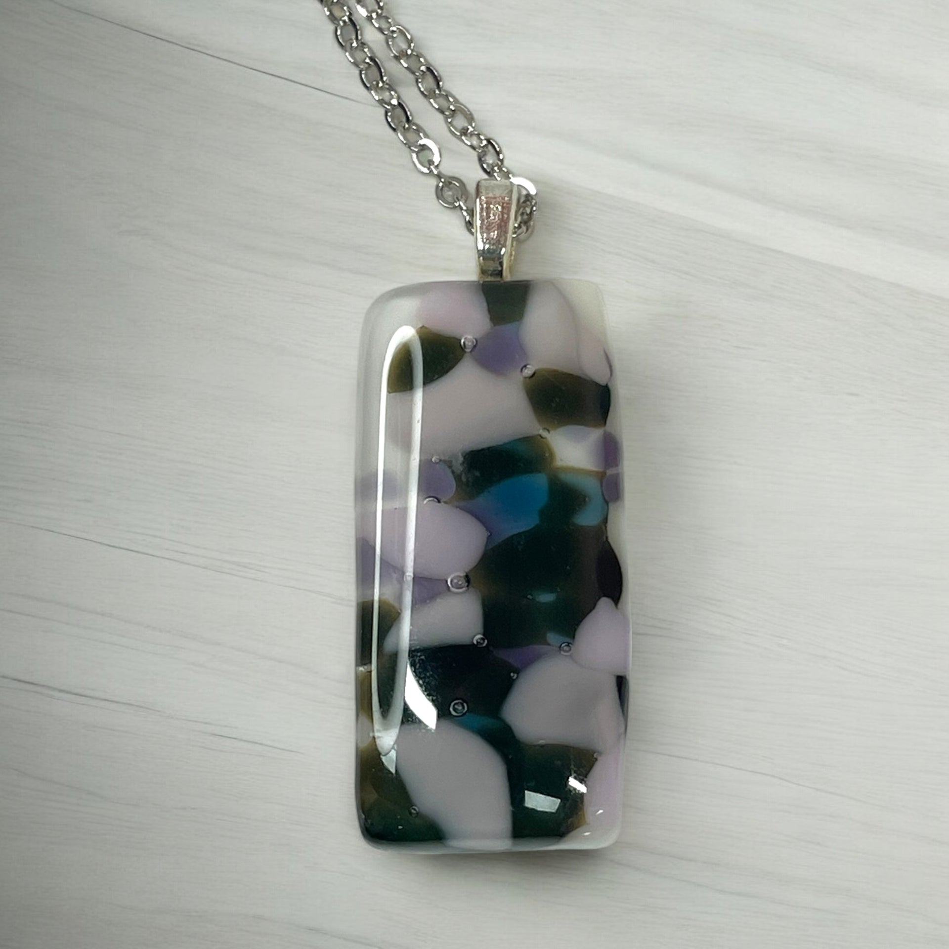 This pendant is rectangular and made of fused glass. Its structure is a mix of translucent, white, lavender-purple, teal, and deep-green pieces seemingly fused together. The colors are blended, creating a mottled effect.