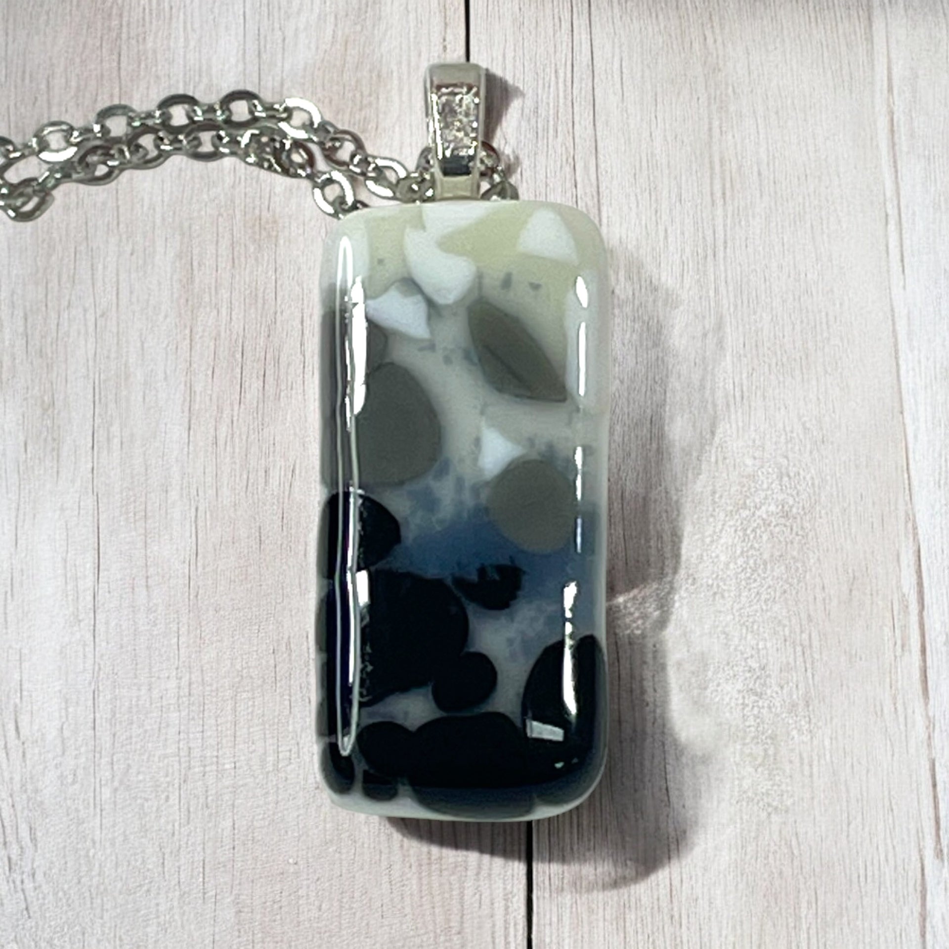 This pendant is made of fused glass that showcases a harmonious blend of colors, primarily black, white, and shades of gray. The intricate patterns created within the piece resemble abstract art, with smooth, rounded shapes that play with light, evoking a sense of depth and motion.