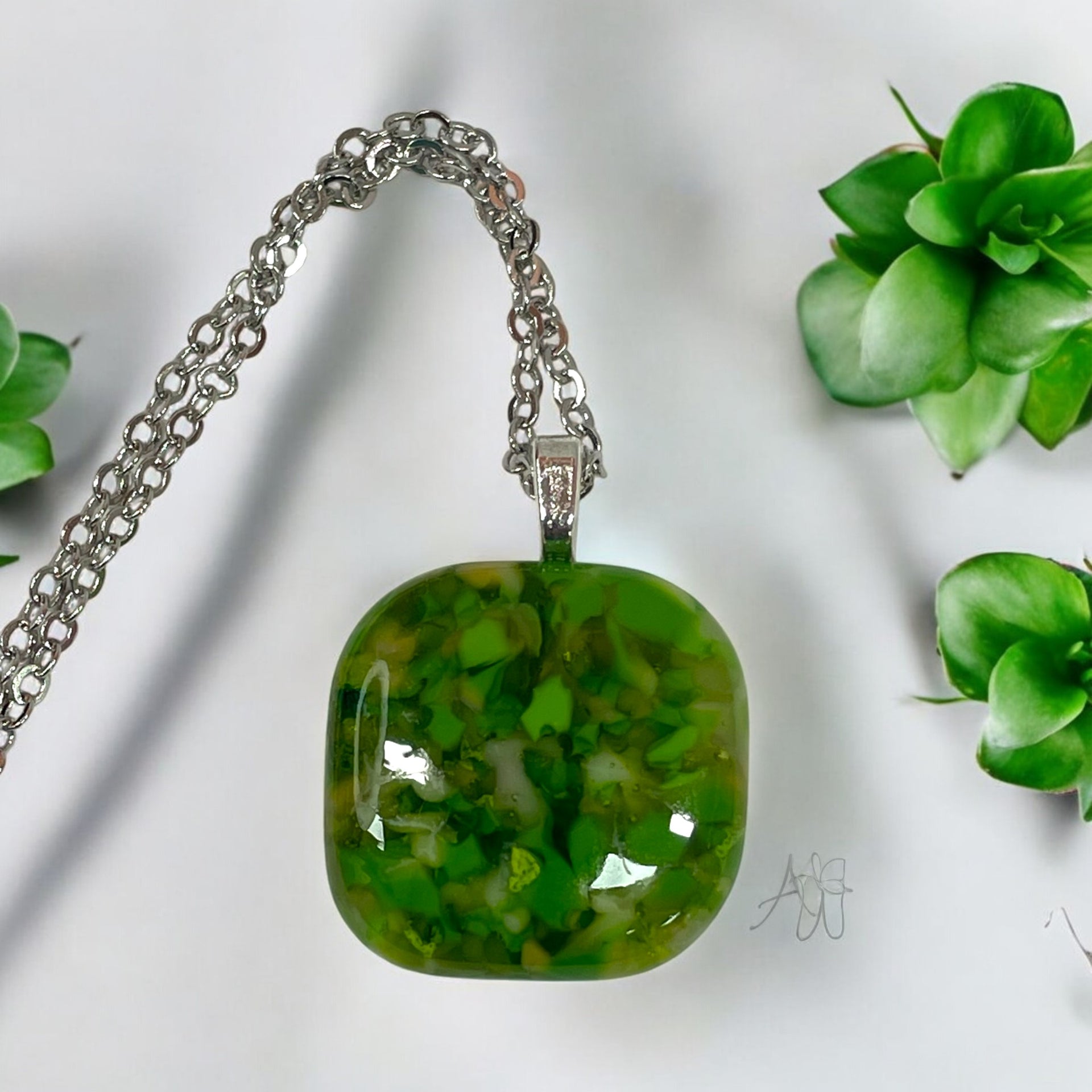 This pendant is a square, cabochon-style piece of fused glass. Its color is a vibrant, somewhat translucent green, with intricate patterns of smaller, lighter-green and whitish-yellow flecks interspersed throughout. The texture looks somewhat speckled or marbled.
