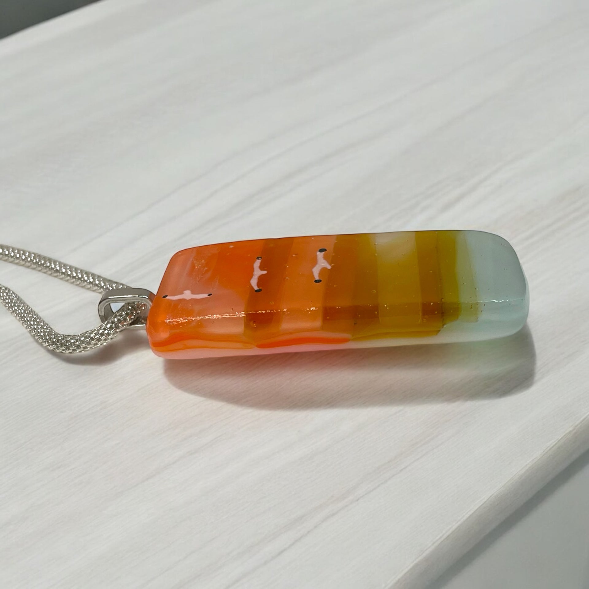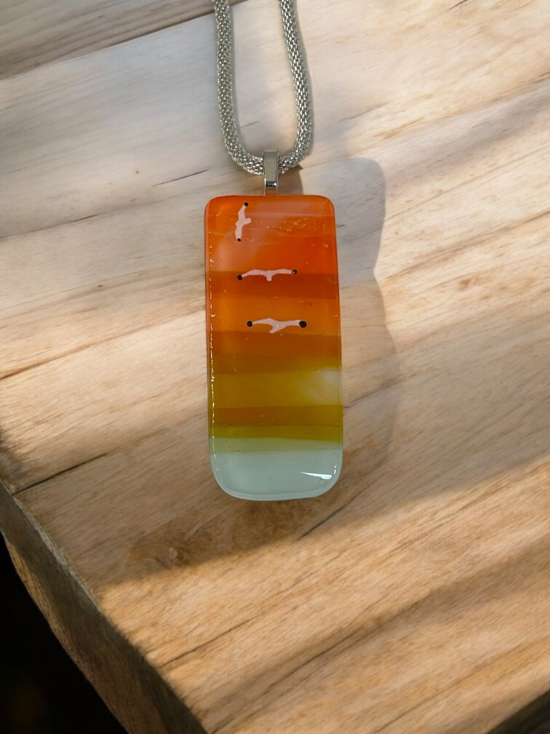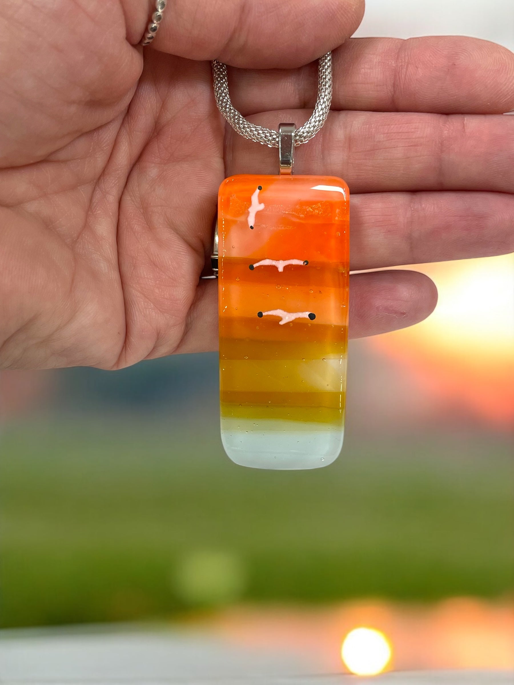 A rectangular glass pendant depicting a sunset. Horizontal bands of orange, amber and pale, almost white blue tones. Small, simple seagulls, are depicted in flight.